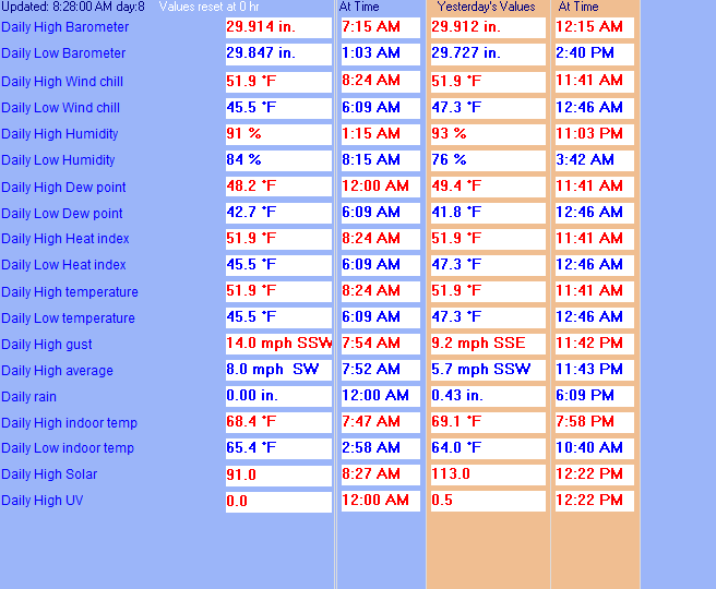 | Maximum Temperature (since midnight) | 49.9°F at: 4:27 AM | Minimum Temperature (since midnight) | 47.3°F at: 12:46 AM |